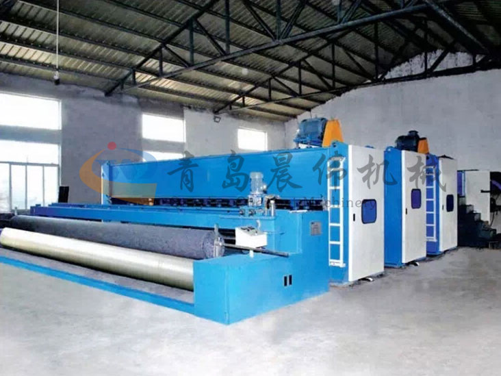 開包機(jī)-開松機(jī)-振動(dòng)給棉機(jī)-梳理機(jī)-鋪網(wǎng)機(jī)-針刺機(jī)-切邊成卷機(jī)