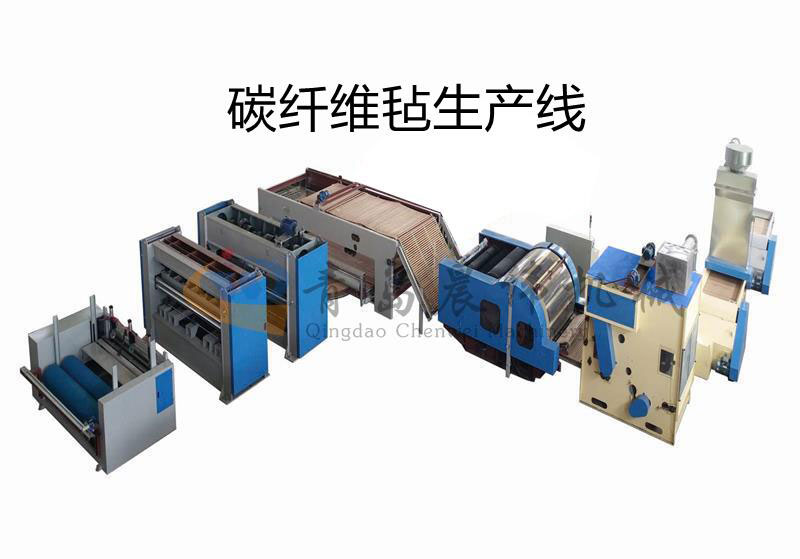 該設備機組主要用于碳纖維網胎層的制備。其工作原理是將短切碳纖維,通過均勻給棉、氣流梳理、鋪網、針刺、成卷等操作過程,制備出具有規定尺寸、克重和均勻度的網胎層。