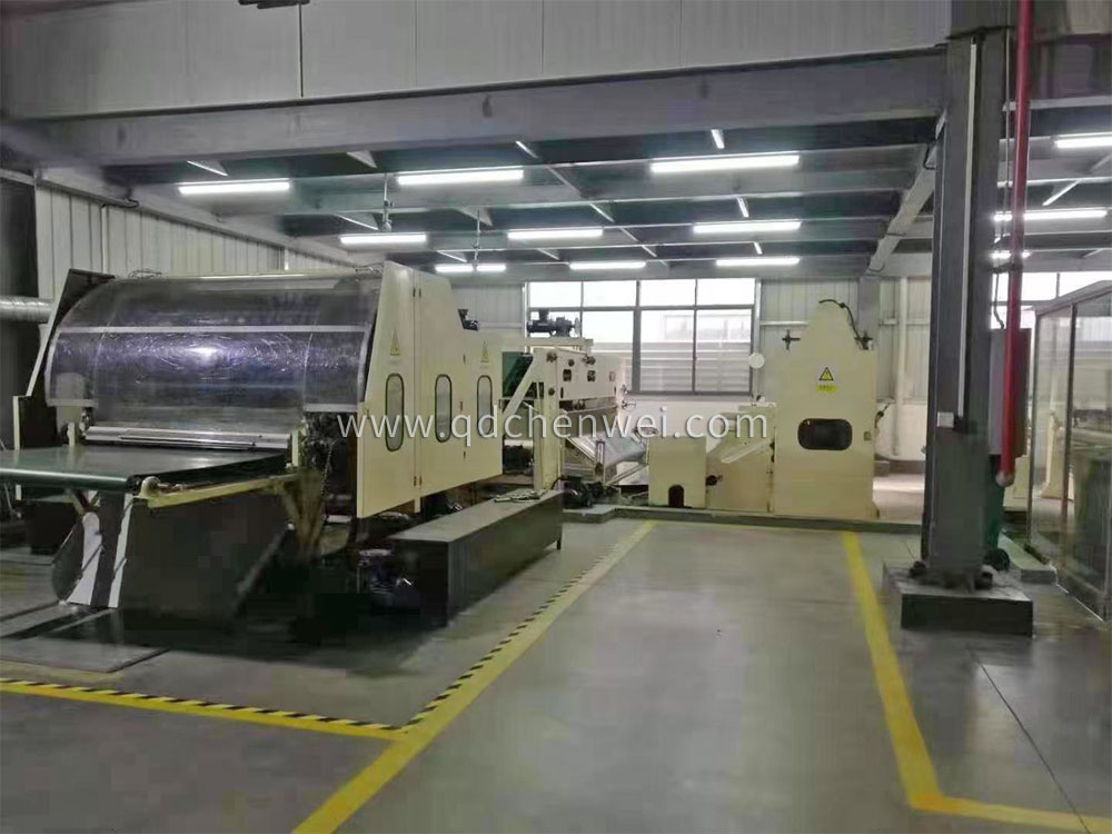 5. CWPW-鋪網機:用于將梳理纖網通過移動小車交叉折疊為所需幅寬和定量的多層纖網,以供后道工序使用。鋪網輥采用特殊結構,加裝壓網輥和導流板,不飄網不起皺,五只大功率電機精確控制各部件的運動,電動輸出簾高度調節裝置